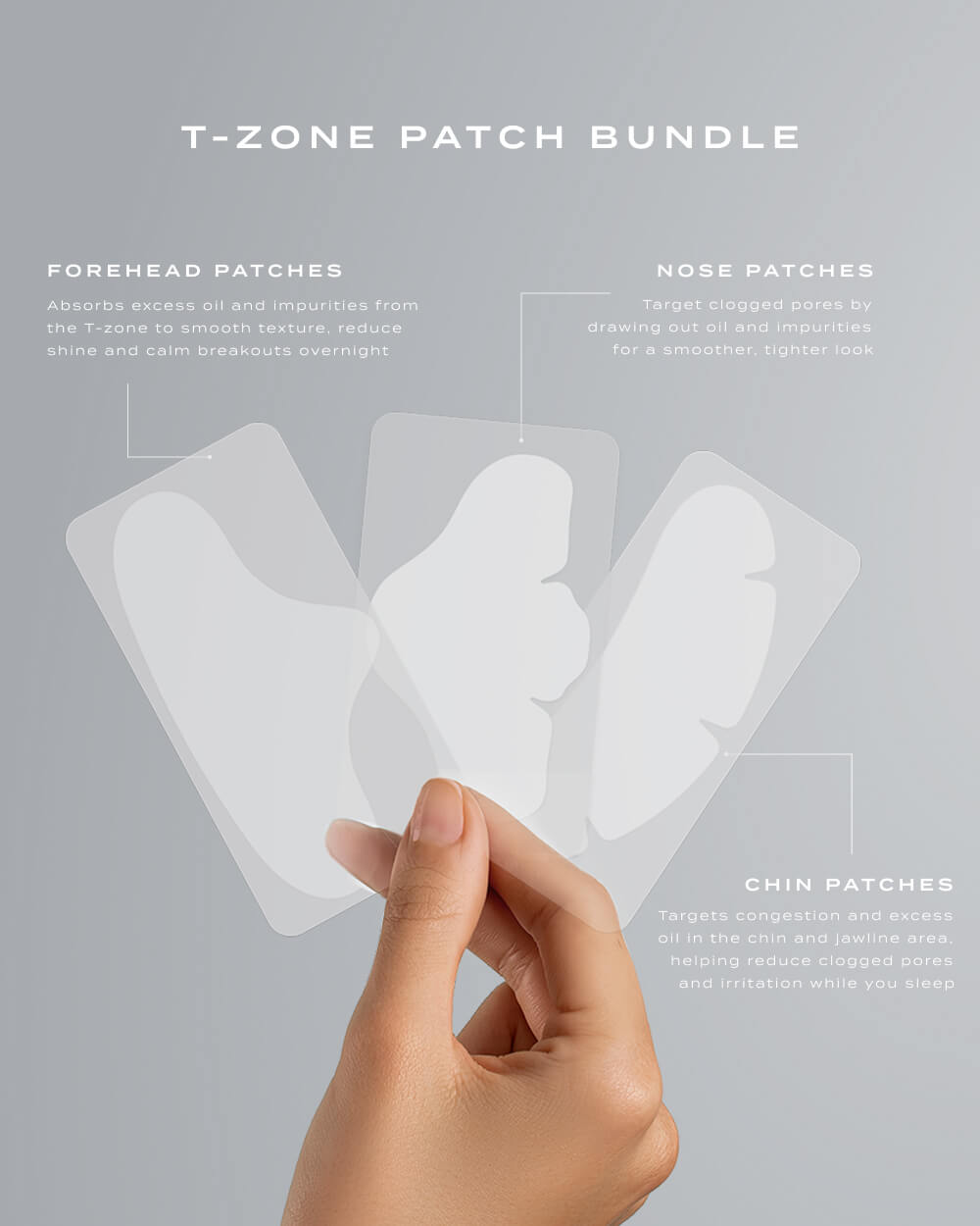 Each patch in this bundle is shaped to fit its specific area, ensuring complete coverage and maximum absorption where your T-zone needs it most.